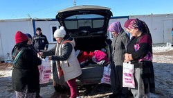 Түркиядагы апаат: Кахраманмарашта дүкөн иштеткен ишкер Э.Рысалиева муктаждарга кийим-кече таратып жатат